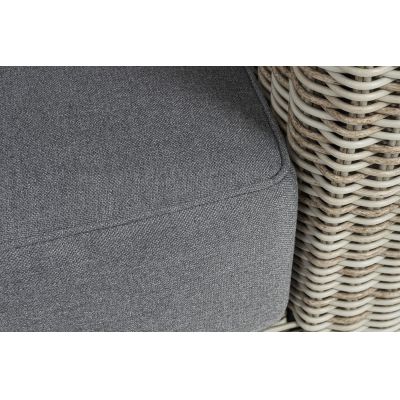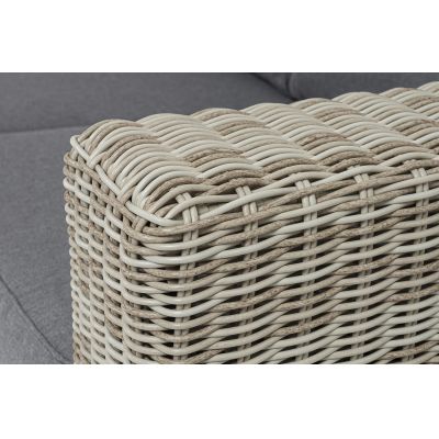 Ручное круглое плетение является основным декоративным элементом мебели. Оно выполнено из искусственного ротанга в бежевом цвете.