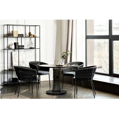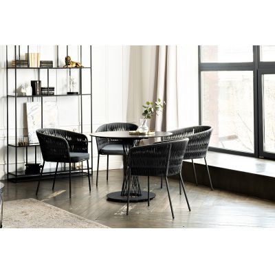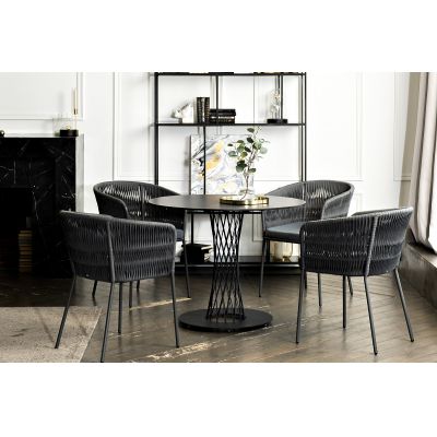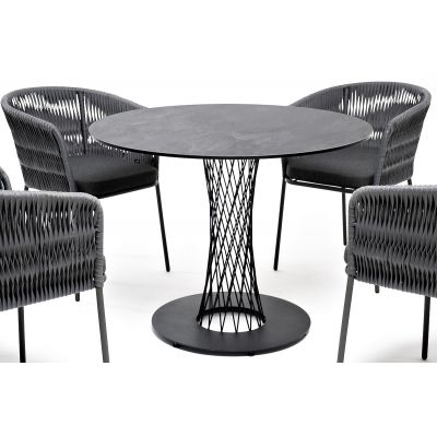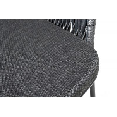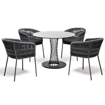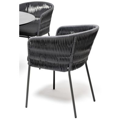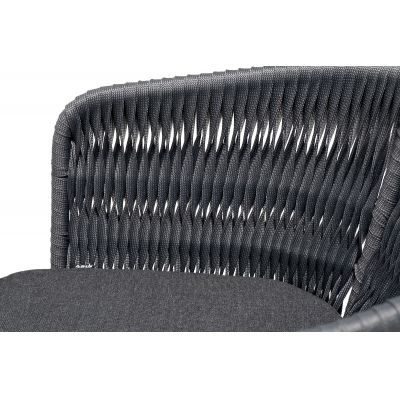 Вместе с этим, в комплектацию входит 4 плетеных стула «Бордо», выполненных с использованием высокопрочного роуп-волокна серого цвета с плетением вида «колос». Стулья имеют размеры 570×620×775 мм и устойчивый каркас из алюминия, окрашенной порошковой краской темно-серого цвета.