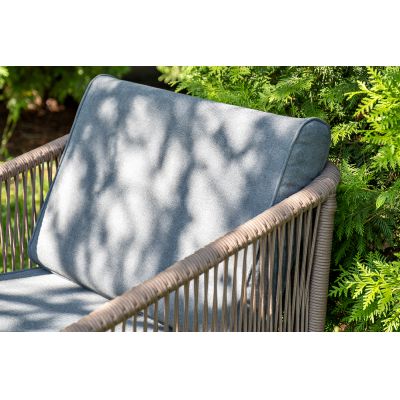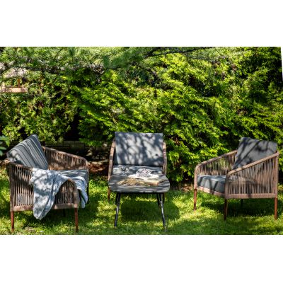 Каркас уличной мебели выполнен из прочного алюминия. Его дополняет коричневая оплетка, изготовленная на основе эластичных синтетических лент из полиэфирных волокон высокой прочности.
