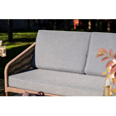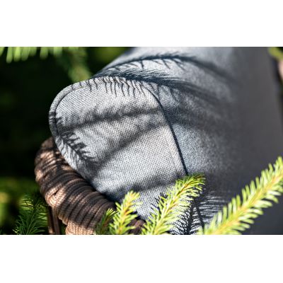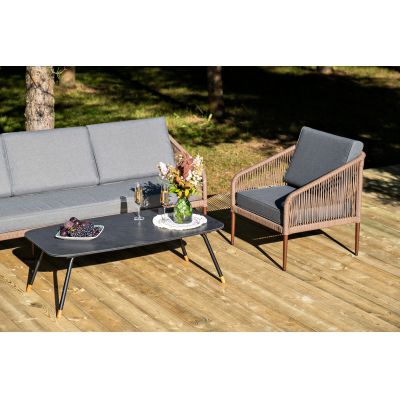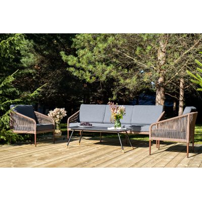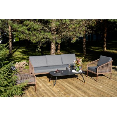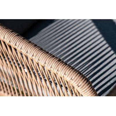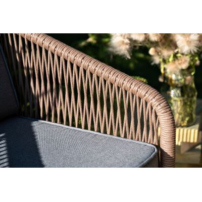 Каркас уличной мебели выполнен из износостойкого алюминия. Его дополняет коричневая ручная оплетка, изготовленная на основе эластичных синтетических лент из полиэфирных волокон высокой прочности.