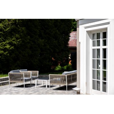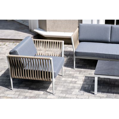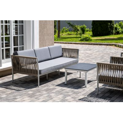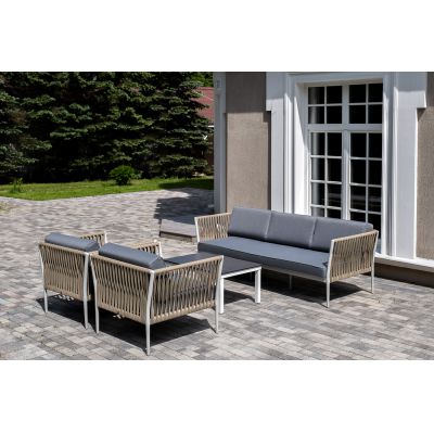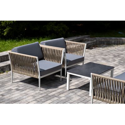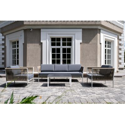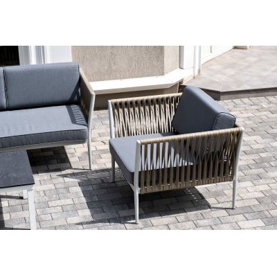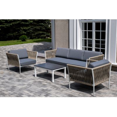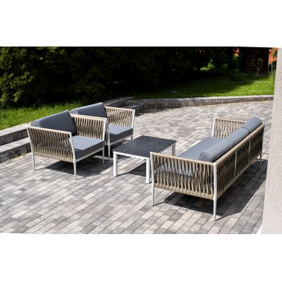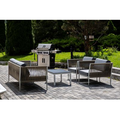 Диван и кресла изготовлены их алюминиевого прочного каркаса, оплетенного ручным способом роупом серо-коричневого цвета. Это эластичные ленты из полиэфирных волокон высокого качества.