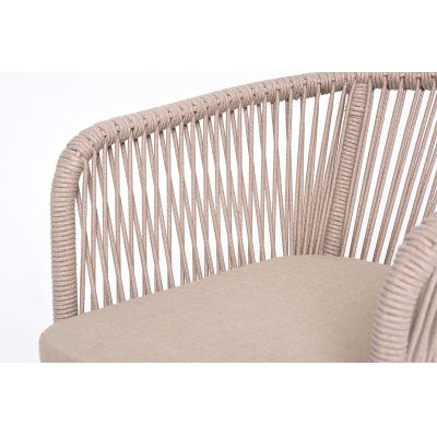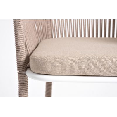Барный стул «Марсель» представлен в стальном каркасе белого (RAL9016) цвета, оплетен вручную эластичными синтетическими лентами из высокопрочных полиэфирных волокон, бежевого оттенка, размер стула: 590×690×1100 мм. Высота сидения без подушки – 760 мм.