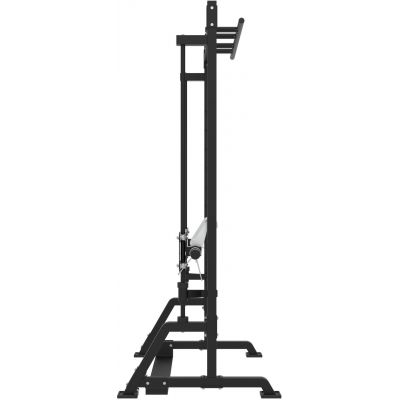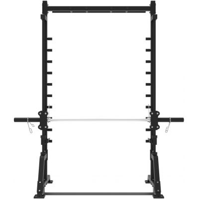 Машина Смита представляет собой силовой тренажёр с массивной стальной рамой чёрного цвета, предназначенный для безопасных и эффективных тренировок. Конструкция выполнена в виде устойчивой прямоугольной рамы с двумя основными вертикальными направляющими, по которым движется гриф, и множеством уровней фиксации по всей высоте стоек, что позволяет устанавливать стартовое и конечное положение штанги на разных уровнях.
