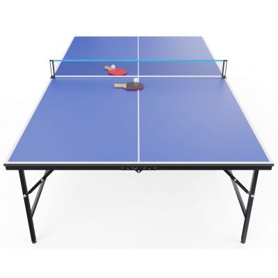 Просторные габариты столешницы обеспечивают комфортное игровое пространство, а надёжная конструкция с компенсаторами неровности пола гарантирует стабильность. В комплект входят все необходимые аксессуары для игры: сетка, ракетки и мячик.