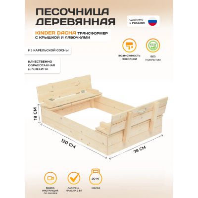 Сомневаетесь? - Посмотрите рейтинг ТОП-10 по категории «Детские игровые площадки»Песочница с крышкой KETT-UP ECO KINDER DACHA изготовлена из массива карельской сосны. Крепкое и надежное изделие станет главным местом для игр с песком. Песочница имеет складную крышку, трансформирующуюся в удобные сиденья со спинкой. Она защищает песок от загрязнений – листьев и мусора, а также закрывает доступ домашним животным – собакам и кошкам.