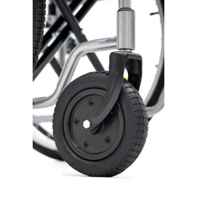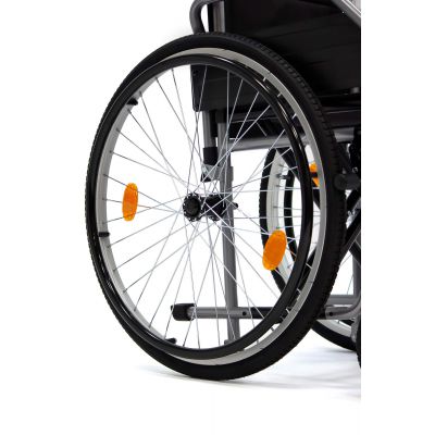 Коляска оснащена пневматическими колесами, которые создают мягкий ход и поглощают вибрации при движении по различным поверхностям. Благодаря этому пользователь ощущает плавность перемещения даже на неровных дорогах и тротуарах. Коляска оборудована боковыми стояночными тормозами, обеспечивающими надежную фиксацию при остановке.