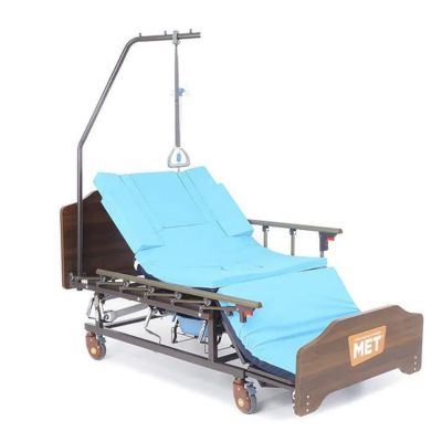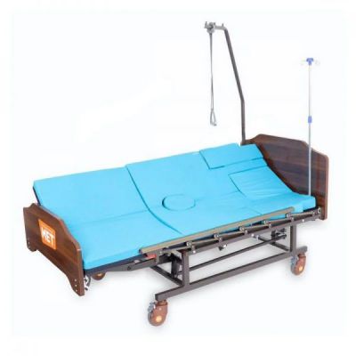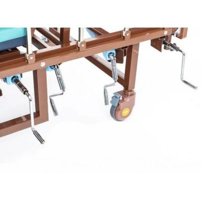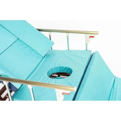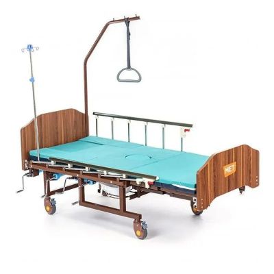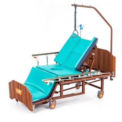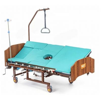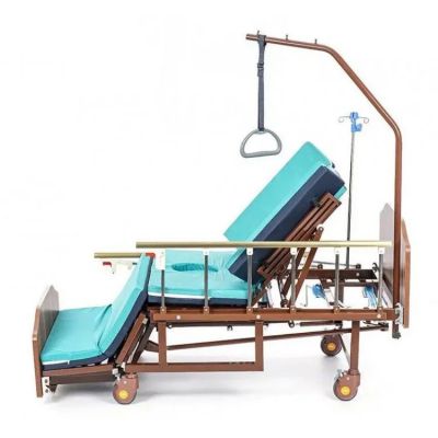 Медицинская кровать с функцией переворачивания, спинками из ЛДСП приятной "деревянной" текстуры, объединяющая в себе функции кардио-кресла и переворачивания больного с санитарным оснащением.