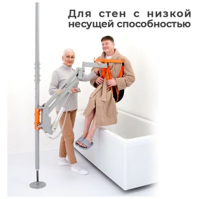 Диапазон изменения высоты 50 см. Итоговая высота зависит от используемого кронштейна, посадки в гамаке и антропометрических данных пользователя. Грузоподъемность подъемника 150 кг (без калитки удлинителя). Принципиально другая посадка в сравнении с классическими подъемниками, траверса располагается не над человеком, а в районе груди.