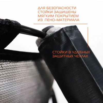 Материал прыжковой поверхности - плотная ткань ПВХ, устойчива к УФ излучению. Плотная сетка крепится к верхним стойкам. Стойки имеют мягкое покрытие из полиэтиленового пено-материала и защитные чехлы, что обеспечивает максимальную безопасность пользователю.