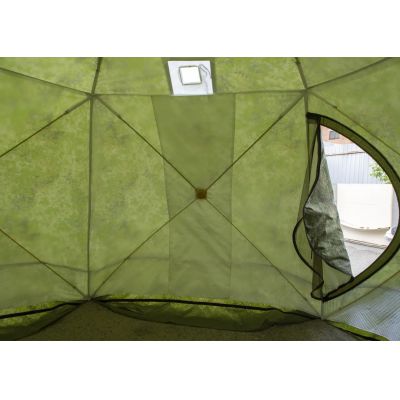 Конструкция имеет вывод под печную трубу, что дает дополнительные возможности для обогрева в холодное время года. Также есть москитная сетка, а значит, палатка подойдет и для летних походов.