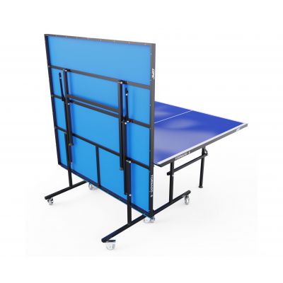 Складная конструкция делает теннисный стол удобным для хранения и транспортировки. В сложенном виде модель отличается компактностью и занимает минимум места, что позволяет удобно хранить её даже в ограниченном пространстве и без труда перемещать с помощью транспортировочных роликов.