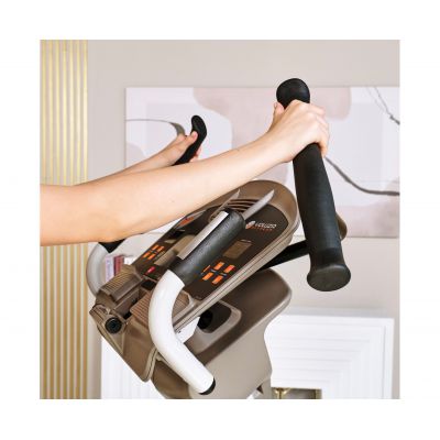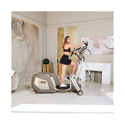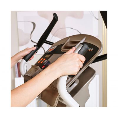Главное достоинство станция 950 в том, что данная модель позволяет сразу тренировать мышцы как верхней, так и нижней части тела. Это достигается благодаря подвижным педалям и двигающимся рукояткам. Пользователь во время занятия совершает не только шаги по эллиптическому радиусу, но и круговые движения руками, нагружая при этом грудную клетку и мышцы пресса.